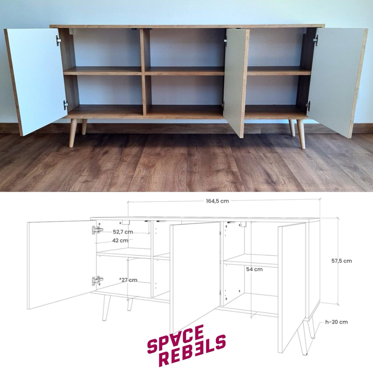 With its generous 164.5 cm width, this sideboard offers extensive interior space, making it the perfect solution for organizing larger collections of books, documents, textiles, or household essentials. It fits seamlessly into a spacious living room, a professional office, or a master bedroom, helping you maintain a clean and elegant environment.